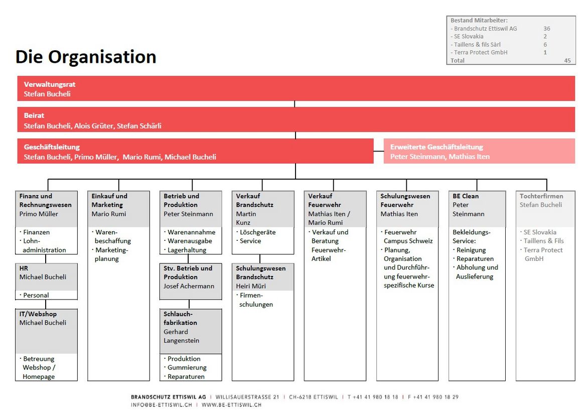 Depuis mars 2017, Brandschutz Ettiswil AG dispose d’un organe de conseil pour soutenir activement l’entreprise avec des idées et suggestions. Sont membres du comité: Stefan Bucheli, gérant, conseil d’administration et président de l’organe de conseil, Alois Grüter, CEO et propriétaire de la société IGD Grüter AG, Stefan Schärli, agent général de la société d’assurances Mobilière, agence Willisau-Entlebuch.