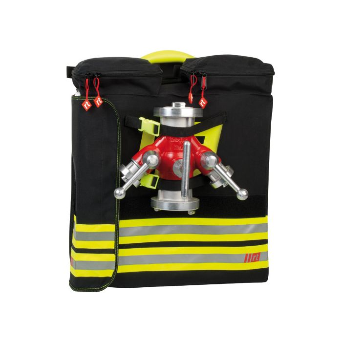 Das komplette Modul Waldbrand hat in diesem Rucksack Platz und kann so einfach an den Einsatzort getragen werden. Die beiden großen Innenfächer bieten Raum für 4 x 15 m 25er (gesamt 60 m) in Buchten gelegt oder bis zu je 2 x 30 m gerollt (gesamt 120 m!). In den rechts und links zu öffnenden Deckeln ist jeweils eine Befestigung für das Hohlstrahlrohr vorgesehen. Die drei Außentaschen bieten ausreichend Platz für Schutzbrillen und Halbmasken. An der Vorderseite des Rucksacks kann ein Verteiler Stroz 55 auf 55 // 2x 25 oder Storz 55 auf 2 x 25 befestigt werden.