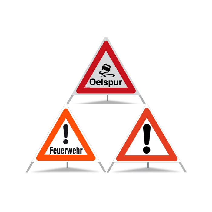 | 04.70307 | 1. Seite: Oelspur mit Symbol Schleudergefahr 2. Seite: Feuerwehr mit !, 3. Seite: alg. Gefahren mit ! | Vollreflex 90 cm | R2 |