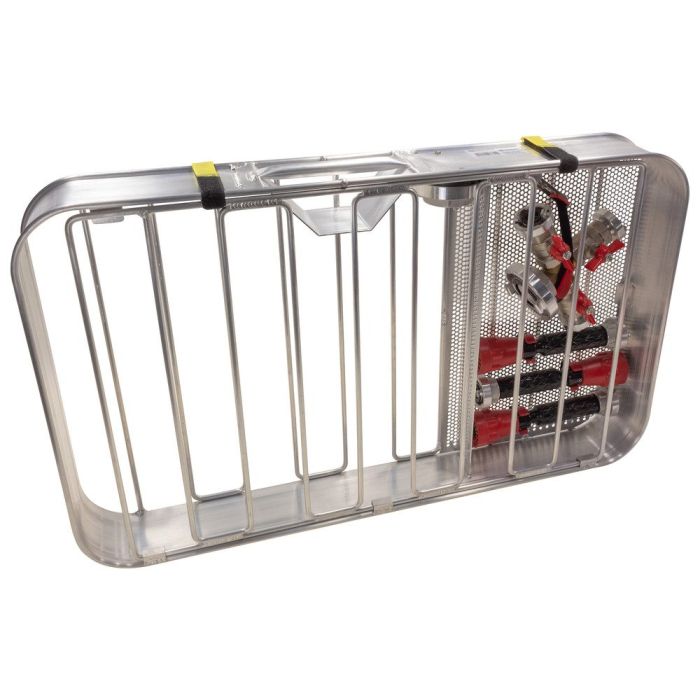 Dans ce panier de transport Wakob, l'équipement est clairement disposé et directement prêt à l'emploi. L'équipement peut être ainsi transporté confortablement jusqu'aux derniers mètres de l'incendie. Les dimensions extérieures de ce panier sont identiques à celles du panier DIN pour tuyaux 55.