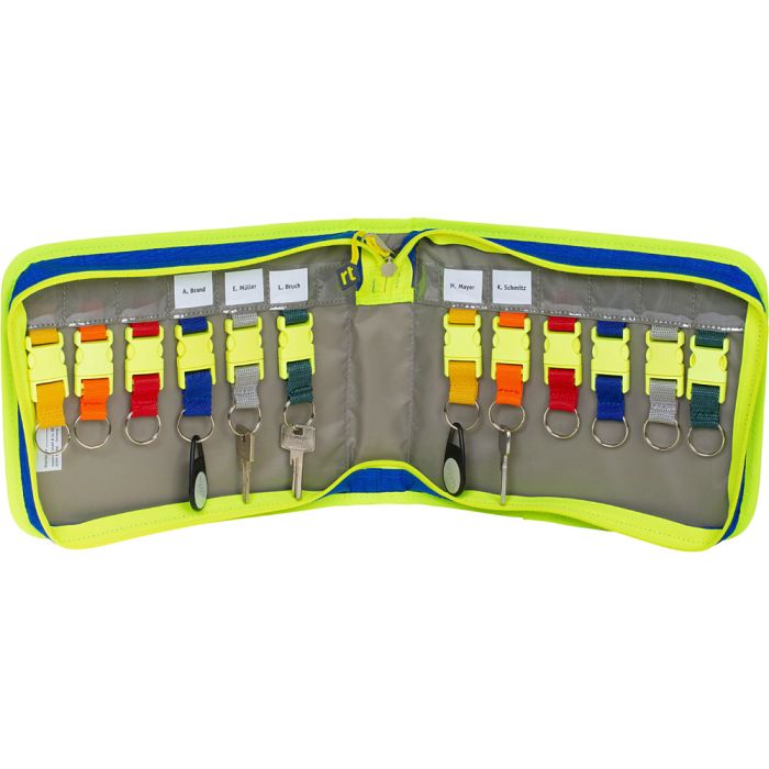 Cette sacoche rescue-tec permet de ranger et transporter jusqu’à 12 clés. Les clips à clés sont équipés de passants de différentes couleurs, facilitant ainsi leur classement dans la sacoche. La couleur de la boucle permet d'attribuer les trousseaux de clés aux différentes places dans le sac. Il n'est pas nécessaire de marquer les trousseaux de clés avec un nom ou une adresse.